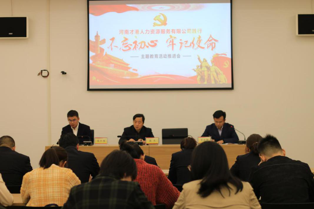為全面貫徹落實習(xí)近平總書記在“不忘初心、牢記使命”主題教育工作會議上的重要講話精神,落實“守初心、擔使命、找差距、抓落實”主題教育總要求,按照航空港區(qū)黨工委、組織部(人社局)在主題教育活動的統(tǒng)一部署要求,河南才港人力資源服務(wù)有限公司于2019年10月25日在興瑞匯金國際3樓第二會議室召開“不忘初心,牢記使命”主題教育活動推進會。會議由才港公司總經(jīng)理李彥明主持,才港公司班子成員、才港公司黨支部全體黨員、全體職工和各局委聘用制員工代表等四十余人參會。
